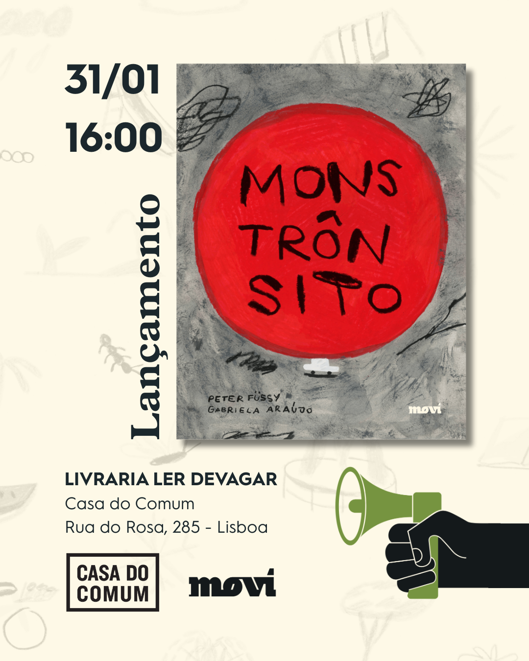 A editora Movi Books lança na Casa do Comum o livro infantil “Monstrônsito”, que fala sobre uma curiosa espécie que se alimenta de carros e aterroriza cidades no mundo inteiro, com impactos na produtividade, no meio ambiente e na qualidade de vida de todos. É um monstro complexo, difícil de ser enganado. Como agimos quando viramos presas dele? Podemos escapar desta criatura terrível?
