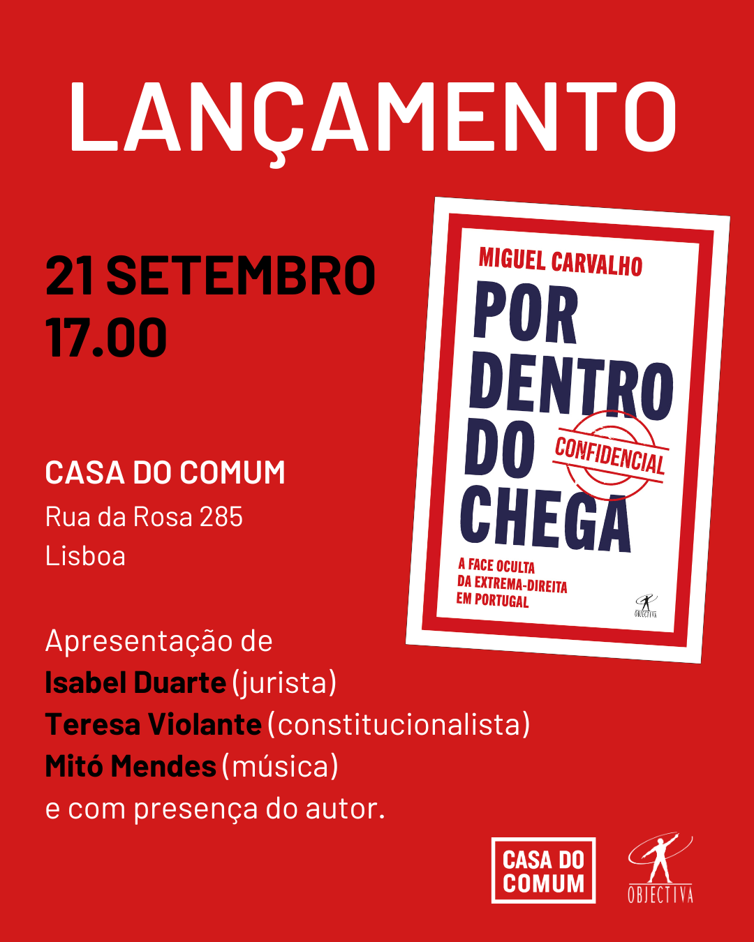 2025/09/21 — 17:00 ‘Por dentro do Chega’ de Miguel Carvalho Lançamento Lançamento do livro ‘Por dentro do Chega – a face oculta da extrema-direita em Portugal’ de Miguel Carvalho Com apresentação de Isabel Duarte, Teresa Violante e Mitó Mendes.